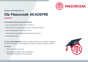 Die Mazurczak GmbH stellt vor: Die Mazurczak AKADEMIE Die Mazurczak AKADEMIE schult Sie und Ihre Mitarbeiter aus Einkauf, Produktion, Technik und Vertrieb in den wichtigsten Punkten, die unsere Produkte betreffen. - Online und völlig kostenfrei! - Ohne unnötige Anreise- oder Ausfallzeiten – Ihr einziges Investment ist ein wenig Zeit. Die nächsten Termine: - Basisschulung I – 11.09.2024 - Basisschulung II – 12.09.2024 jeweils von 09.00 bis 12.00 Uhr